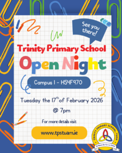 We are delighted to invite prospective pupils and their families to our Open Night. This is a lovely opportunity to visit our school, meet our friendly staff, see our classrooms, and learn more about the happy and caring environment we provide for our children. We look forward to welcoming you through the doors of Trinity Primary School and sharing all that makes our school a special place to learn and grow.