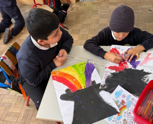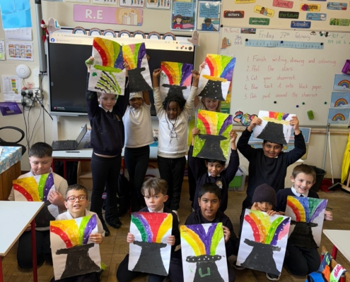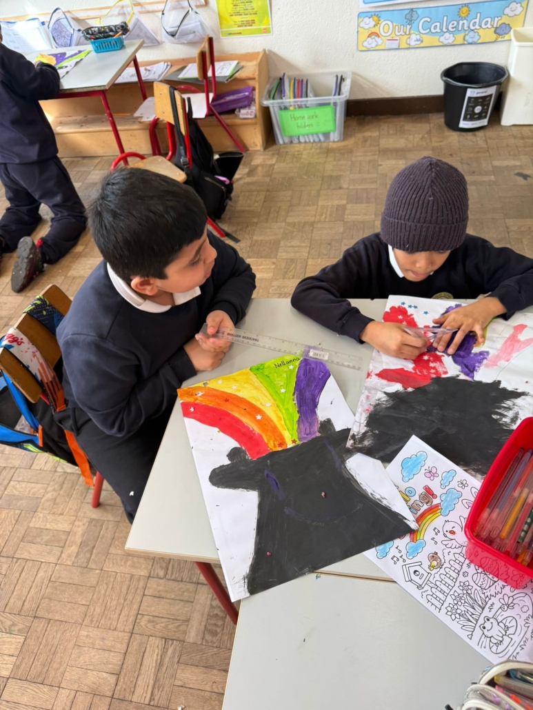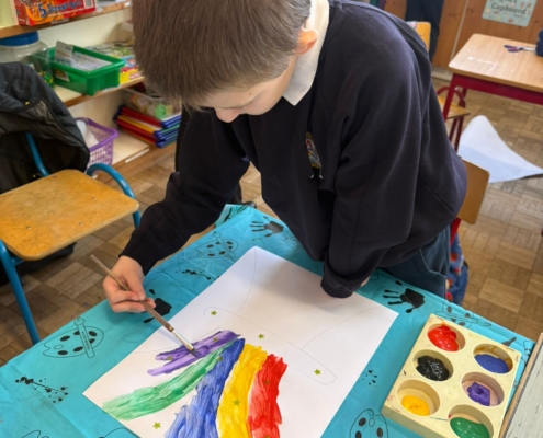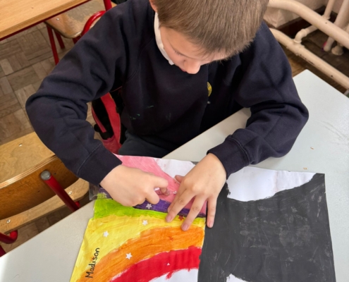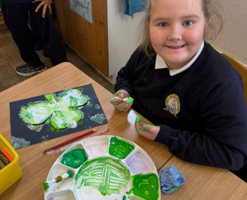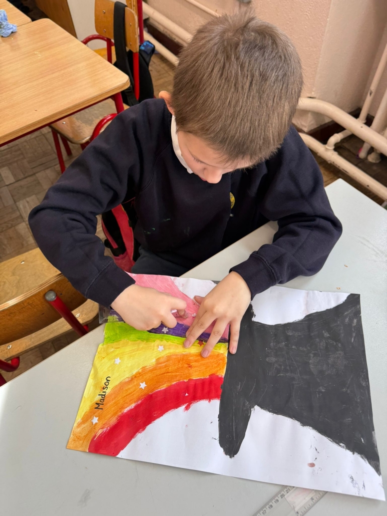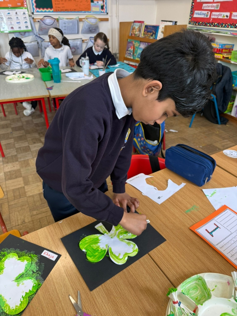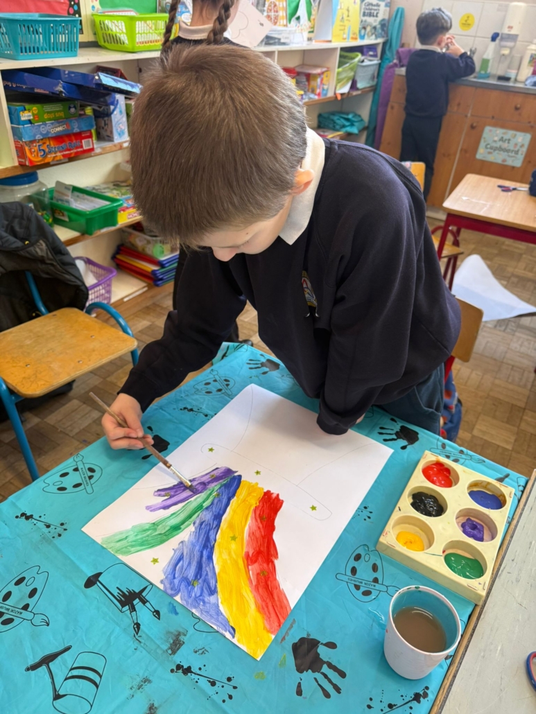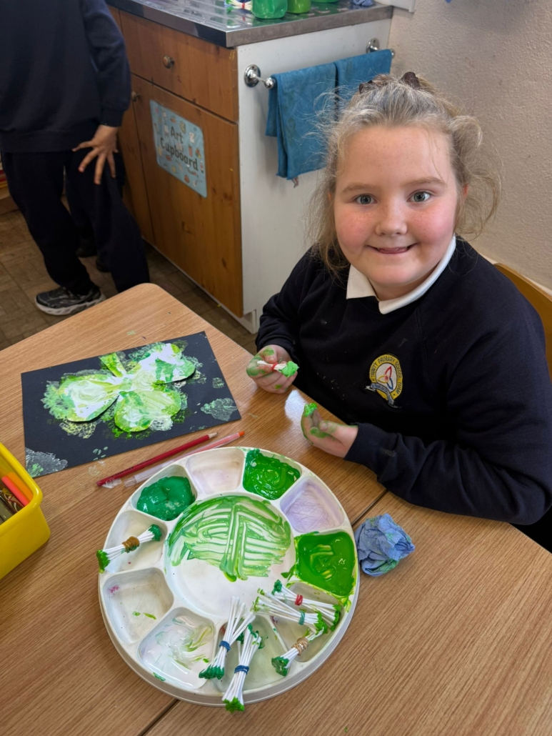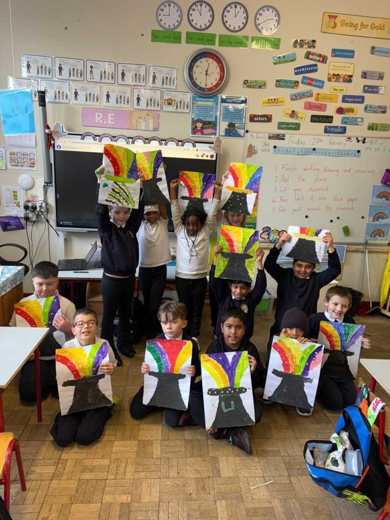 To finish off our day, we got into the St. Patrick’s Day spirit! We painted pots of gold under bright rainbows, adding extra stars to make them sparkle and shine . We also cut out shamrocks and used cotton buds to paint them in different shades of green – they turned out amazing!