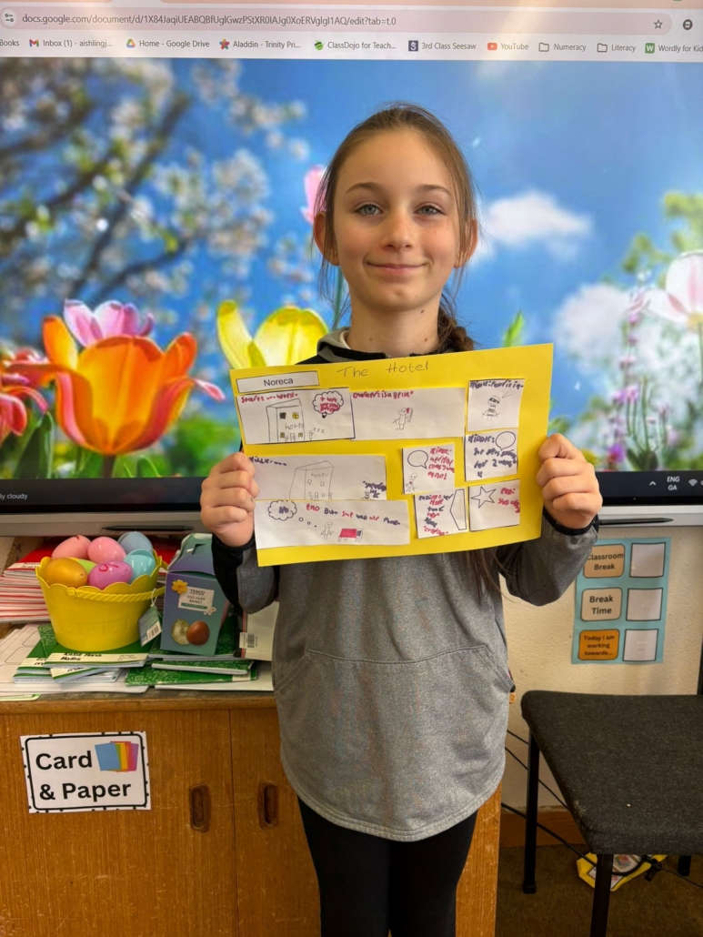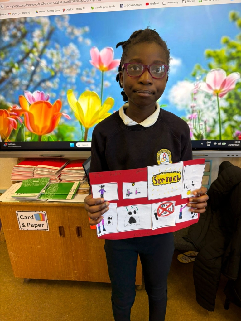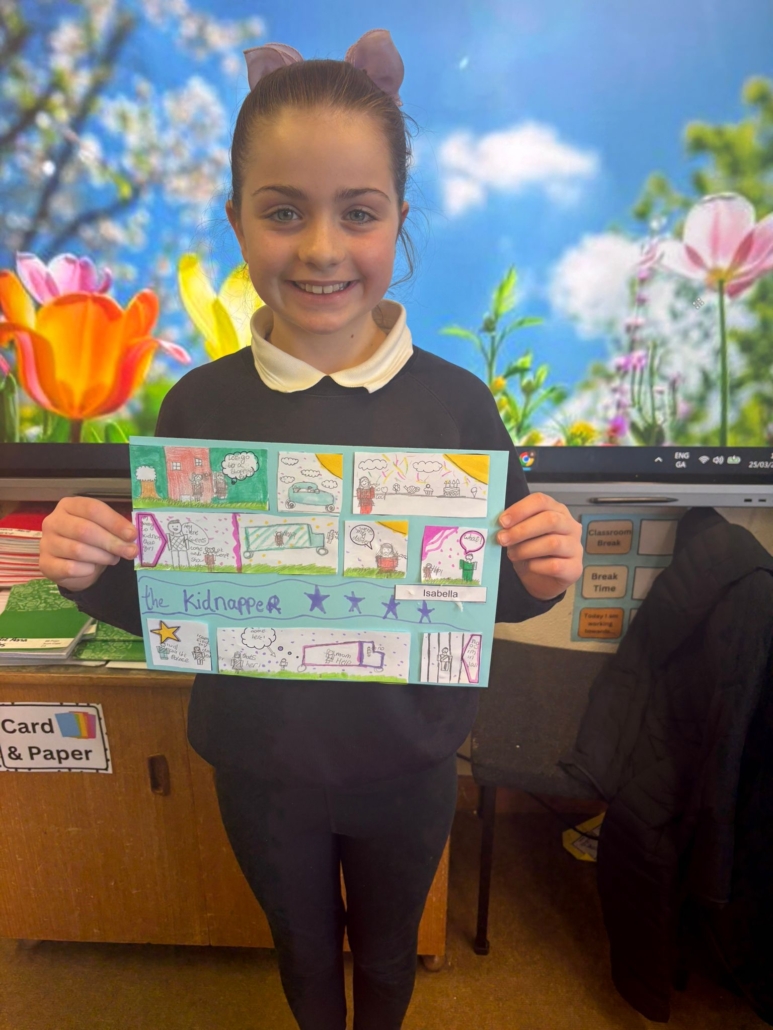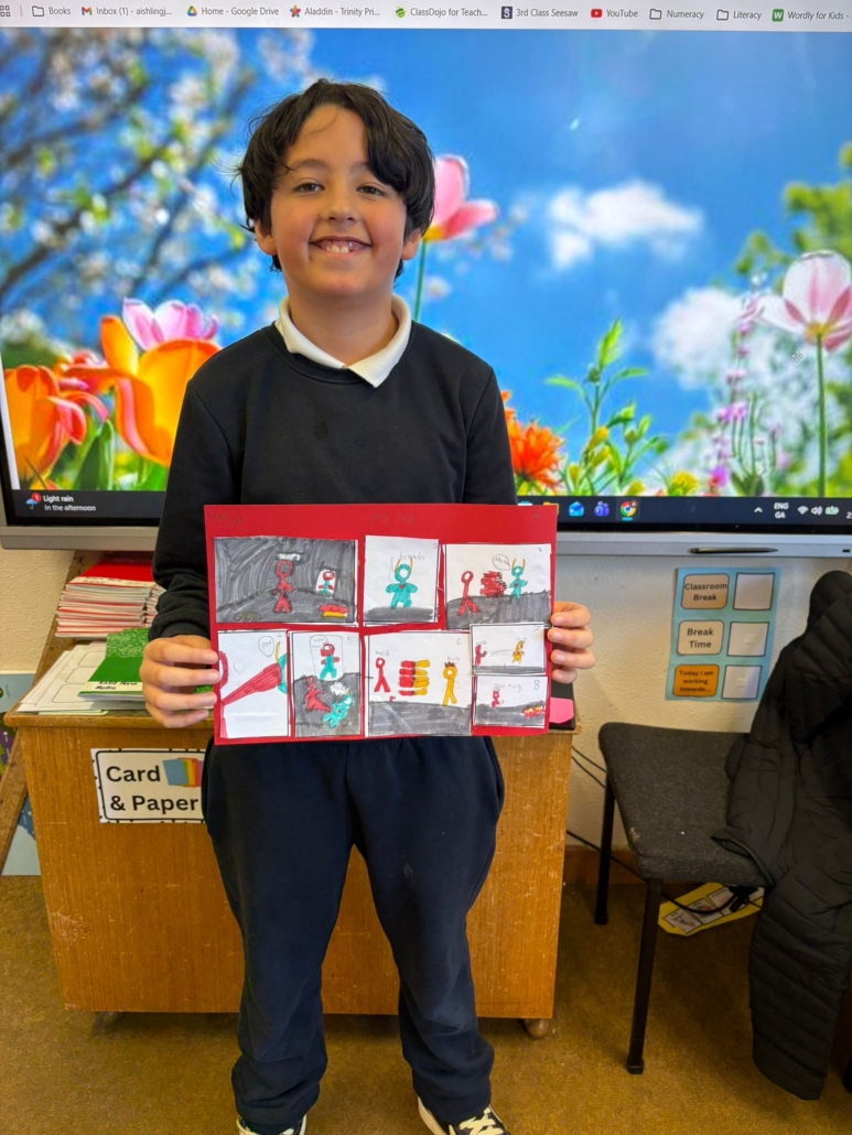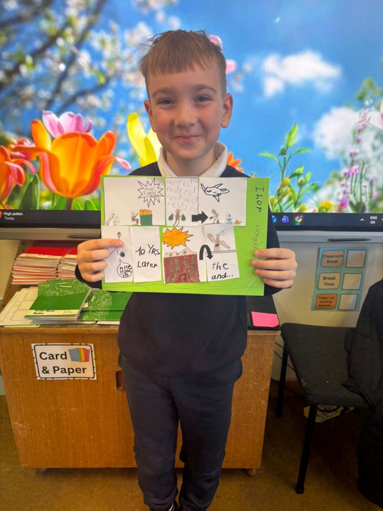 After Áine Ní Ghlinn’s inspiring visit to 3rd class yesterday, where we explored the magic of “wordless books,” the creativity continued today as we created our very own wordless stories! 🖍️📖