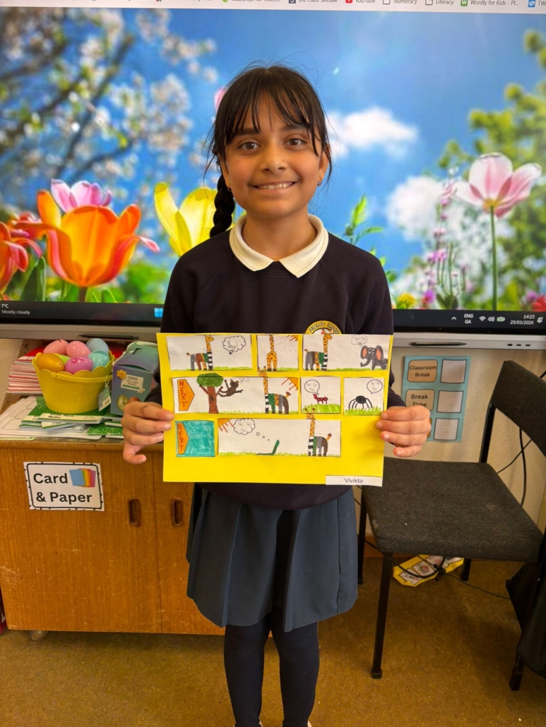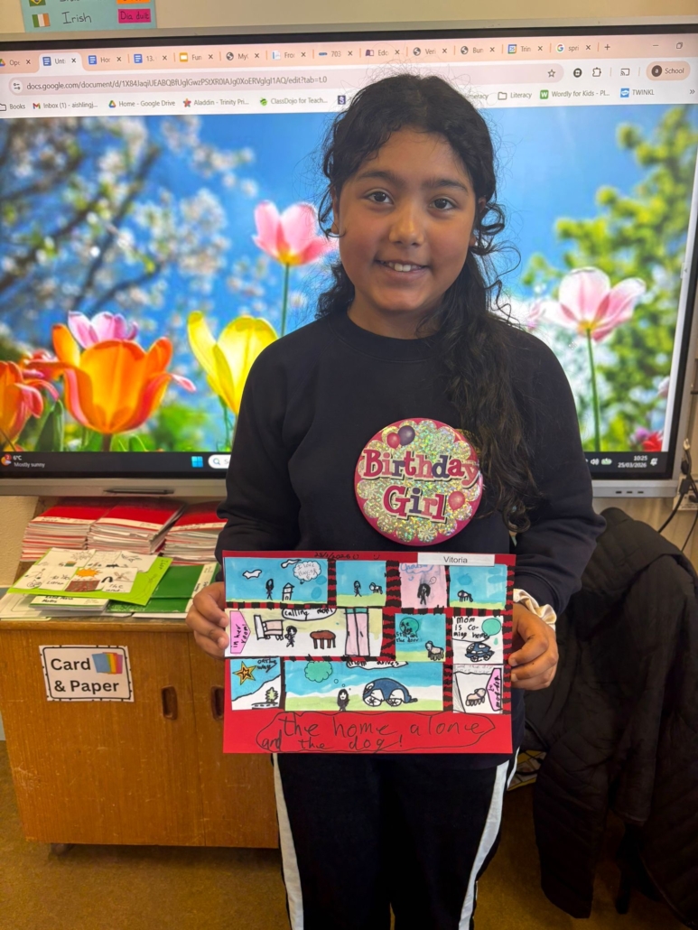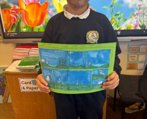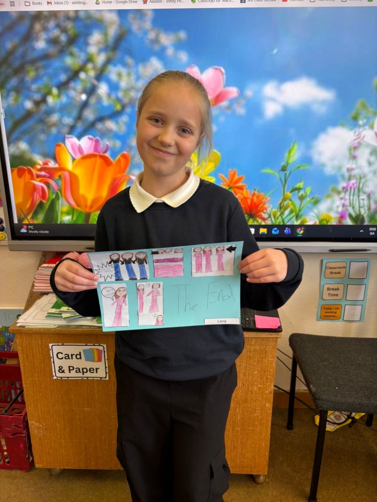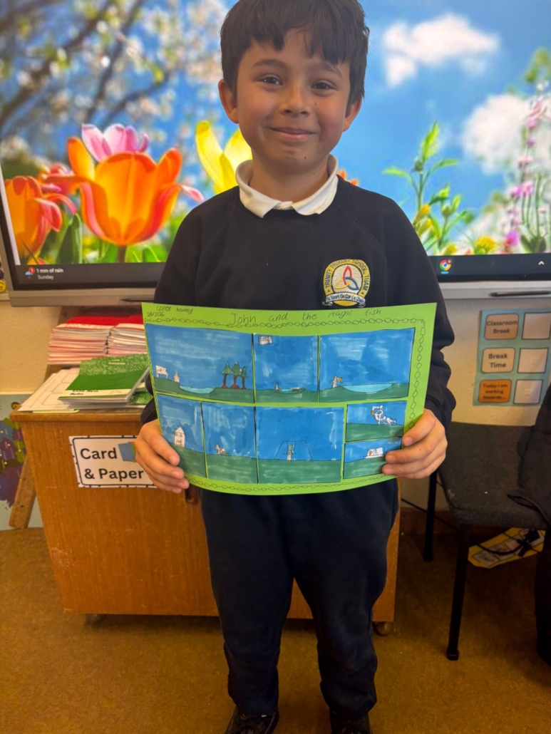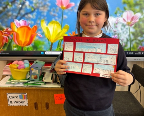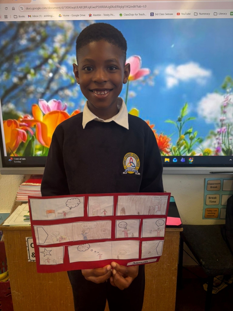 After Áine Ní Ghlinn’s inspiring visit to 3rd class yesterday, where we explored the magic of “wordless books,” the creativity continued today as we created our very own wordless stories! 🖍️📖