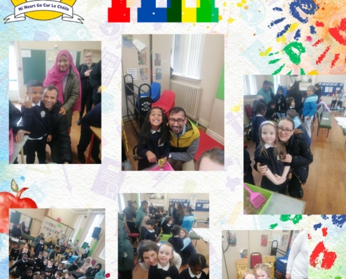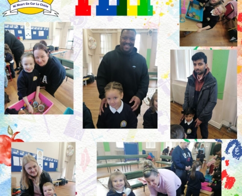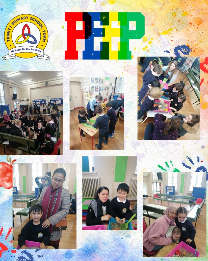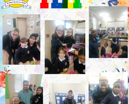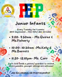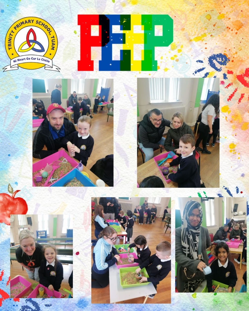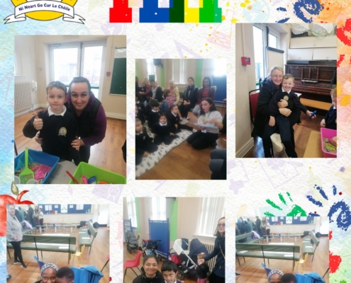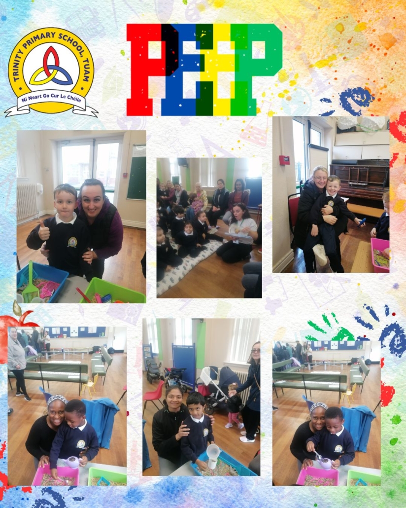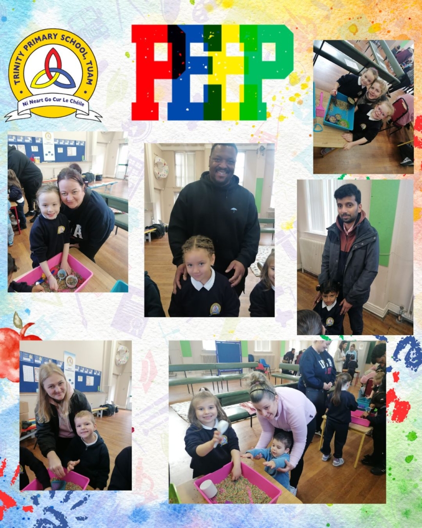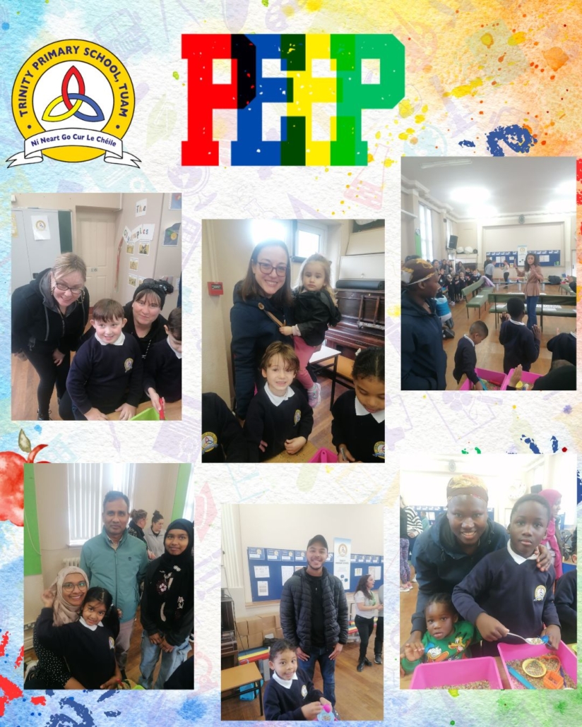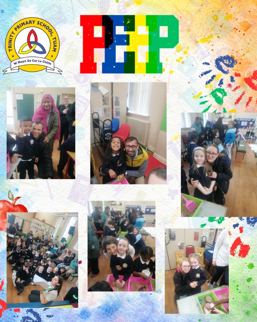 The peep programme takes place yearly in all Junior infant classes. It’s a 4 week intervention led by the HSCL, class teachers and school completion personnel alongside parents. It helps parents support their children’s learning through play and engaging activities that build parent, child and school relationships. A session integrates story, song and rhyme and arts subjects (music, drama and art education). It promotes the wellbeing of all involved. It is a foundation for oral language acquisition and later reading and writing development. The overall goal is “doing with” rather than “doing to” parents.